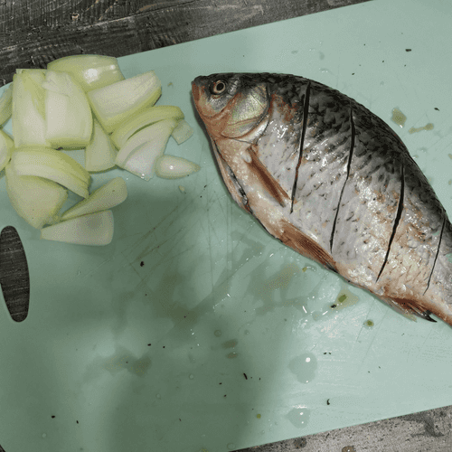Рыбу неглубоко надрезать несколько раз по бокам.