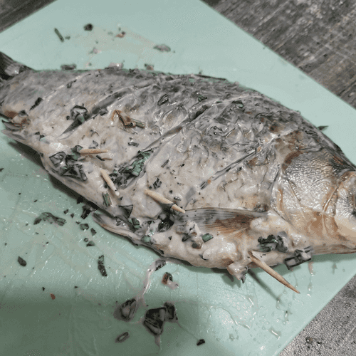Промокнуть карася бумажными салфетками, смазать получившимся соусом снаружи и изнутри, затем закрепить низ боков зубочистками.