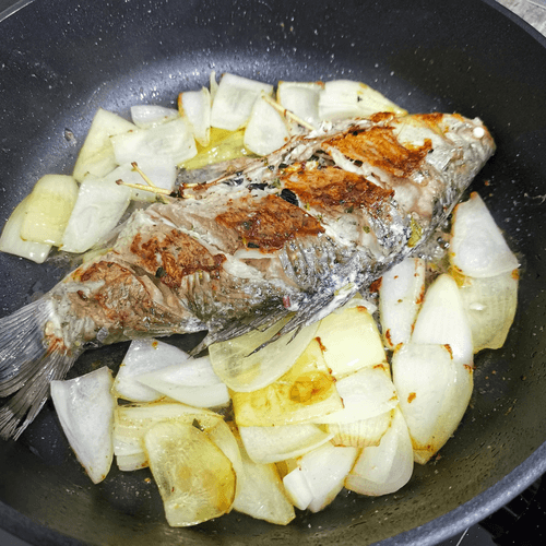 В разогретое на сковороде сливочное и оливковое масло выложить рыбу и лук.
