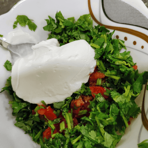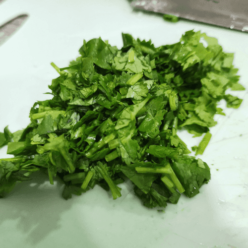 Кинзу мелко порубить.