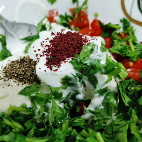 Приправить черным перцем и сумахом. Тщательно перемешать.