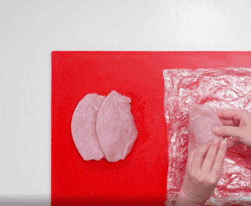Каждый из стейков отбить, накрыв их пищевой пленкой. Отбить нужно тонко, но так, чтобы в филе не образовались дырки.