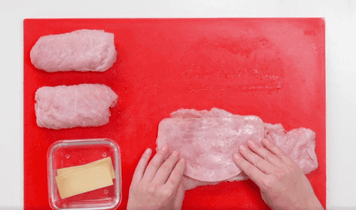 Снять пленку с заготовки кордон блю, обвалять ее в муке, затем окунуть в яйца и хорошенько обвалять в панировочных сухарях.