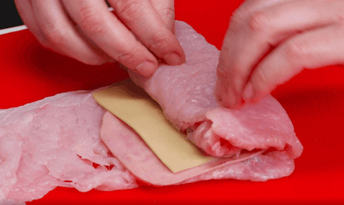 На отбитый кусок индейки выложить тонкие ломтики ветчины и сыра, отступив от краев по 2 см.