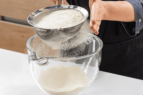 Просеять муку в дежу миксера. Оставить 50 грамм на подпыл. Добавить яйца, соль (6 г) и воду.