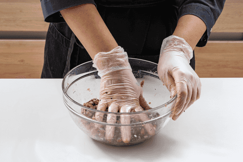 Тщательно перемешать и выбить фарш. Если фарш получился слишком сухой, можно добавить немного воды или бульона. Оставить в холодильнике на 15 минут.