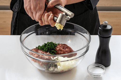 Смешать говяжий и свиной фарш, добавить лук, петрушку, листья тимьяна и пропущенный через пресс чеснок. Посолить и поперчить.