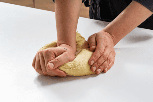 Когда тесто соберется в ком, продолжить месить его на столе, пока оно не станет гладким и однородным.