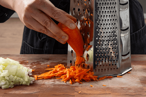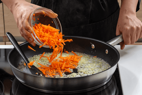 В большой сковороде разогреть растительное масло и обжарить сначала лук до слегка золотистого цвета. Добавить морковь и жарить еще 2–3 минуты.