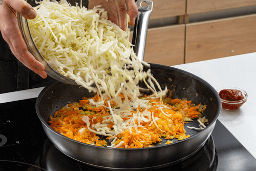 Добавить в сковороду капусту и томатную пасту, тушить на огне ниже среднего помешивая около 15 минут. Посолить и поперчить по вкусу. Дать начинке остыть, прежде чем лепить вареники.
