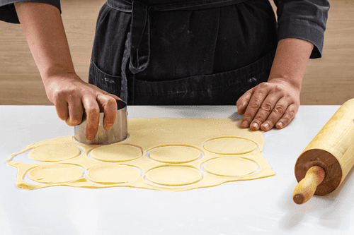Раскатать тесто в тонкий пласт и вырезать из него кружочки с помощью стакана или специальной вырубки.