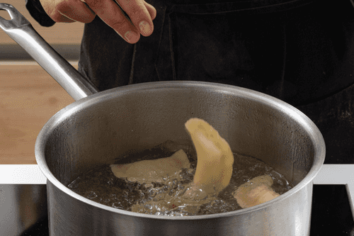 В большой кастрюле вскипятить подсоленную воду и бросить в нее вареники. После того как вареники всплывут, варить их еще 2–3 минуты, а затем вынуть шумовкой.