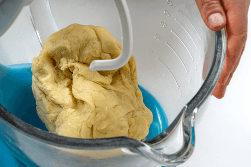 Когда тесто соберется в ком, продолжить месить его на столе, пока оно не станет гладким и однородным.