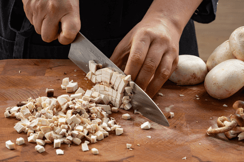 Также мелкими кубиками нарезать грибы.