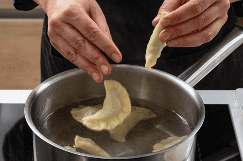 В большой кастрюле вскипятить подсоленную воду и бросить в нее вареники. После того как вареники всплывут, варить их еще 2–3 минуты, а затем вынуть шумовкой.