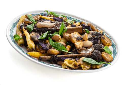 Вокруг выложить овощи, украсить базиликом и подавать.