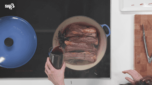 Положить к ребрам тимьян и розмарин, влить вино. Дождаться, когда вино закипит, дать ему выпариться в течение 4 минут.