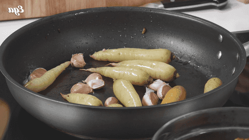 Морковь и неочищенные зубчики чеснока бросить в ту же сковороду. Жарить также до золотистой корочки.
