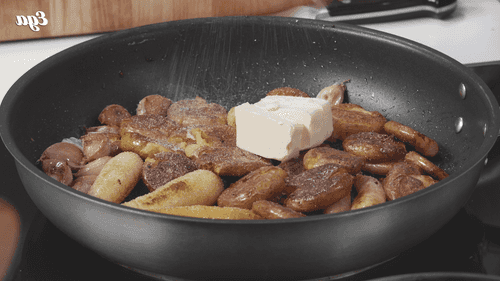 Вернуть картофель в сковородку, добавить 50 грамм сливочного масла и посолить. Аккуратно перемешать в течение 2 минут и снять с огня.