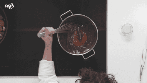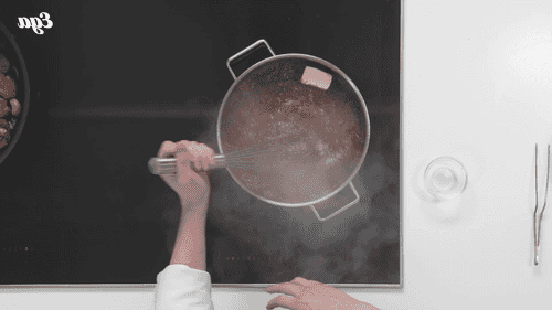Убавить огонь, добавить в сотейник сливочное масло и вмешать его венчиком.