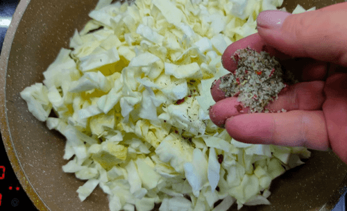 Нарезанную капусту сложить в сковороду, добавить растительное масло и соль с травами.