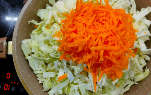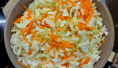 Все перемешать и оставить тушиться под крышкой на 10 минут (необходимо смотреть на готовность капусты: чтобы она не перетушилась, но и не была жесткой, все зависит от сорта).