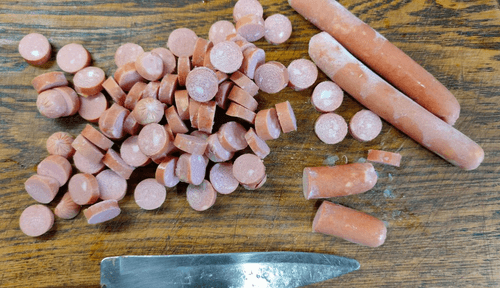 Овощи очистить и помыть, сосиски, если необходимо, освободить от кожуры и разморозить.