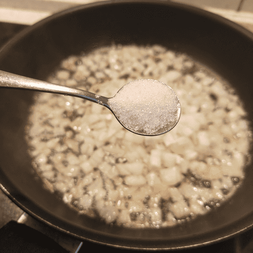Добавить неполную чайную ложку сахара и щепотку соли для карамелизации.