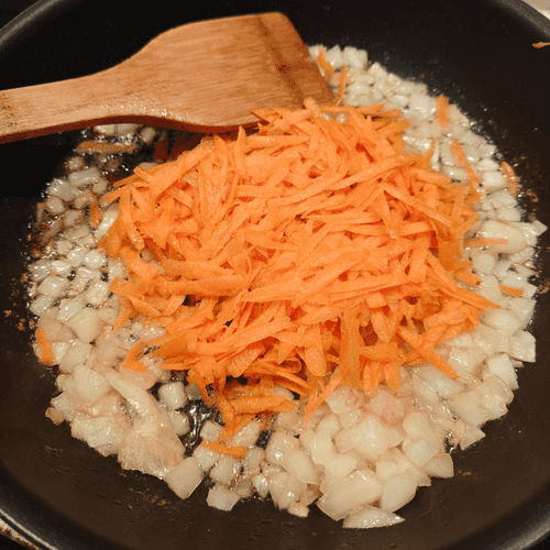 На крупной терке натереть морковь и добавить в лук. Обжарить до мягкости и убрать в миску.