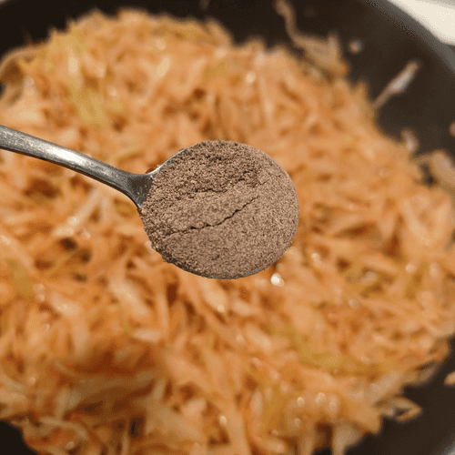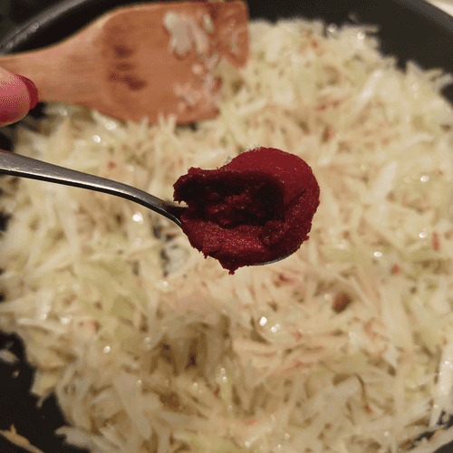 Как только капуста смягчится, добавить ложку пасты и влить воду. Хорошо перемешать деревянной лопаткой.