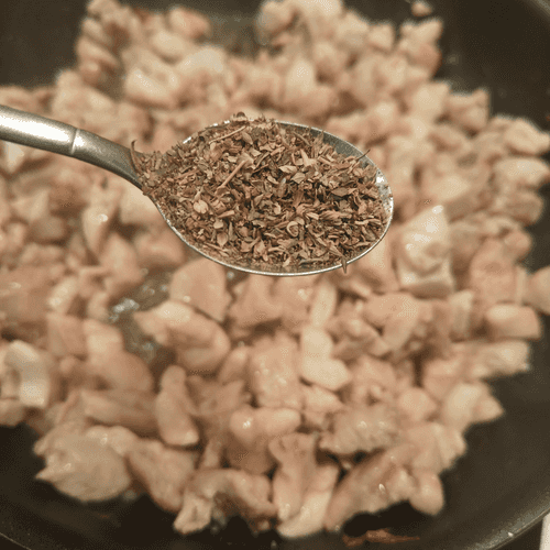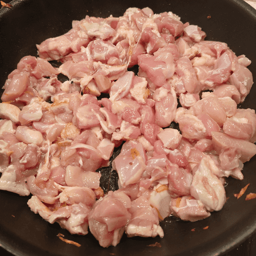 Куриные бедрышки нарезать небольшими кубиками и обжарить на той же сковороде, что и овощи. Посолить.
