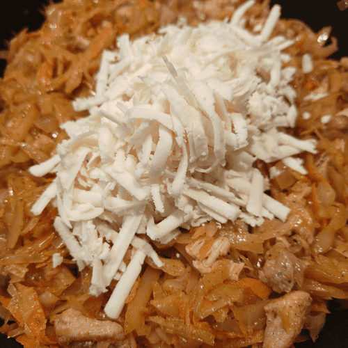 Посолить, поперчить по вкусу и переложить капусту к моркови с луком.