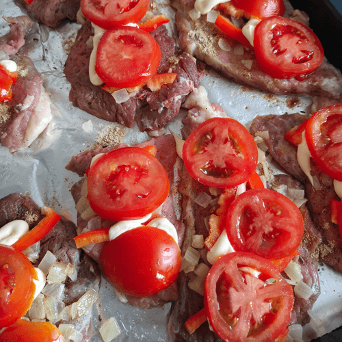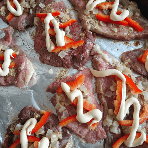 Выложить перец на каждый кусок мяса, а сверху немного полить майонезом.