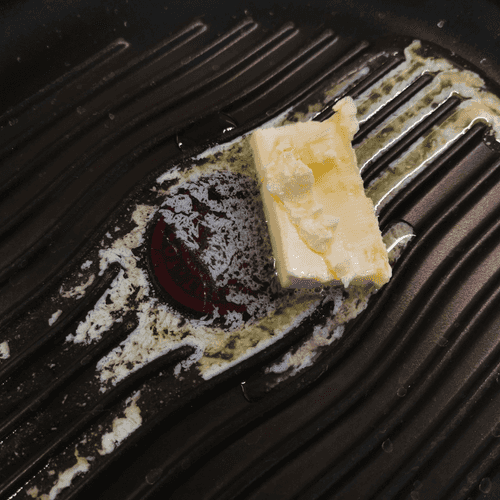 В сковороде гриль растопить оливковое масло и 1 кусок сливочного масла.