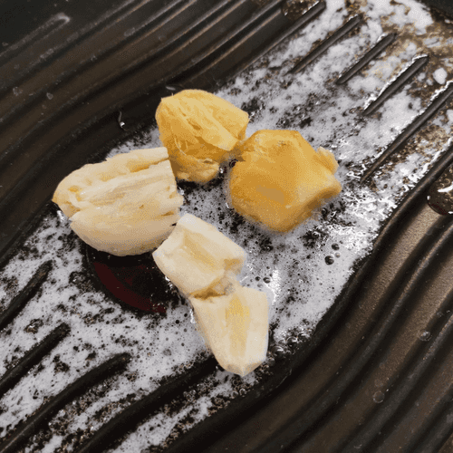Как только чеснок и имбирь слегка подрумянятся, перевернуть.