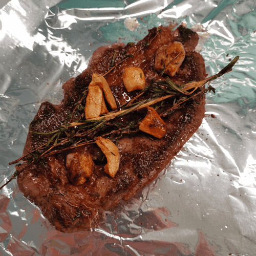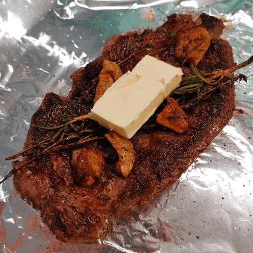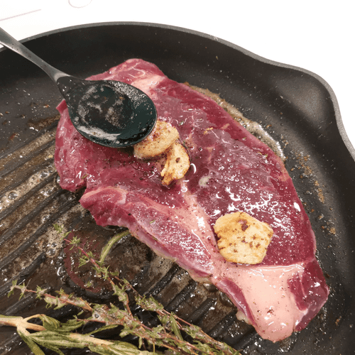 Как только нижняя сторона хорошенько подрумянится, перевернуть стейк. Полить ароматным маслом. Готовить до румяной корочки на среднем огне.