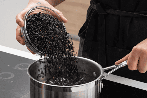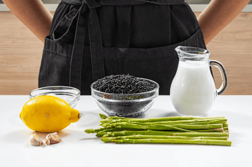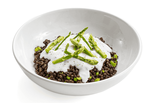 В данном рецепте чечевица служит основой, на которую щедро укладываются хрустящие спаржевые ростки. Черная чечевица «белуга», напоминающая черную икру, придаст блюду особенно элегантный вид, но можно использовать и зеленую или коричневую чечевицу, и результат будет также замечательным.