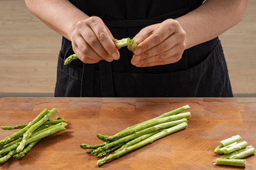 Отломить одеревеневшие нижние части стеблей спаржи, а верхушки отрезать и отложить на украшение.