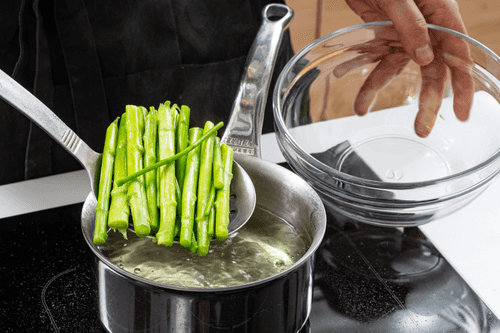 В сотейнике вскипятить подсоленную воду, бросить туда стебли спаржи и отварить до состояния аль денте, 2–3 минуты.
