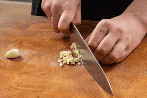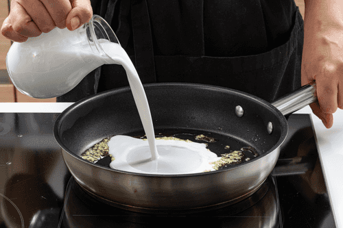Разогреть в сковороде оливковое масло и обжарить на нем чеснок в течение 15–20 секунд, далее влить кокосовое молоко и довести до кипения.