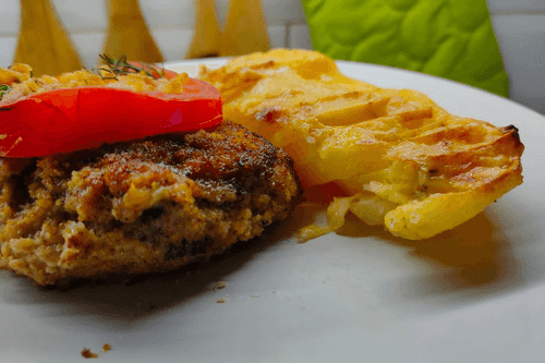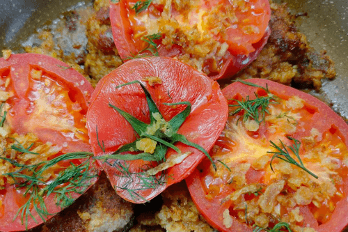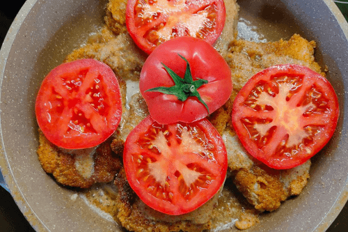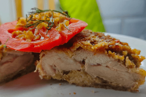 Отбивные из индейки в панировке — это изысканное блюдо европейской кухни, сочетающее хрустящую золотистую корочку и нежное мясо индейки. Это блюдо популярно благодаря своей простоте и потрясающему вкусу. Индейка, пропитанная ароматами травяной соли и топленого масла, становится удивительно сочной, а панировочные сухари придают аппетитную текстуру. Истоки блюда уходят в традиции западной кухни, где мясные отбивные давно стали символом домашнего уюта и гастрономического наслаждения. В завершающем этапе на отбивные выкладываются сочные кольца свежего помидора и зелень, что придаёт блюду свежесть и визуальную привлекательность. Идеально подходит как самостоятельное угощение или в сопровождении легкого гарнира, таких как картофельное пюре или овощной салат.