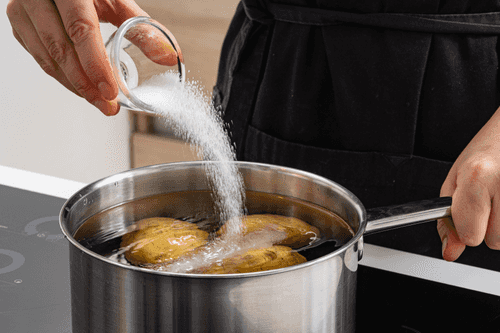 Картофель помыть, переложить в кастрюлю, залить водой, добавить соль (в пропорции 10 г на 1 л) и отварить до готовности.