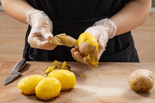 Готовому картофелю дать немного остыть и очистить от кожуры. Важно, чтобы картофель при этом оставался горячим.