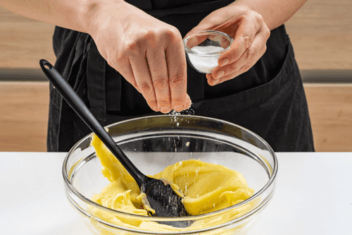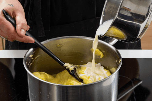 Подогревая пюре, постепенно, по одному, добавить в него холодные кубики масла, постоянно перемешивая деревянной или силиконовой лопаткой.
