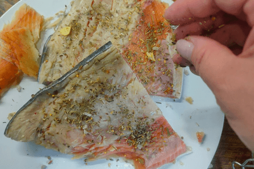 Натереть рыбу с двух сторон приправой и посолить.