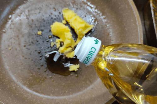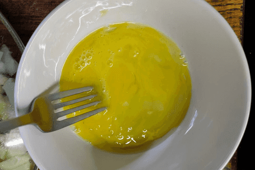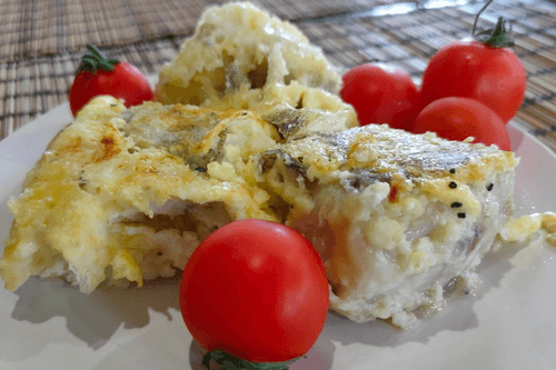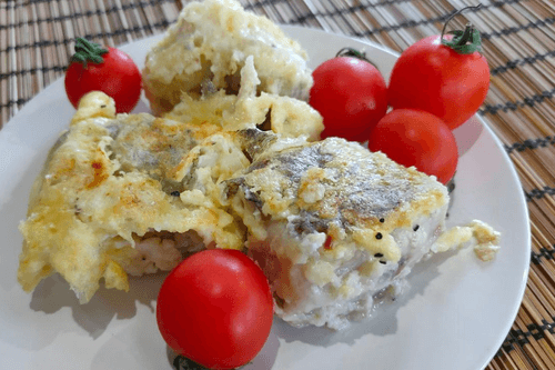 Выложить рыбу в кляре на сковороду и залить остатками яичной смеси.