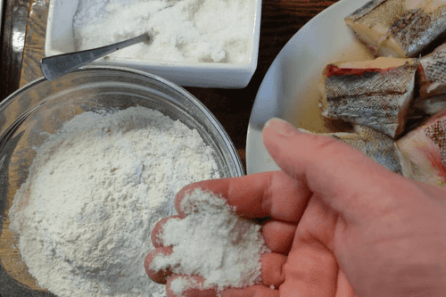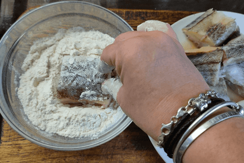 Каждый кусок рыбы как следует обвалять в муке со всех сторон.