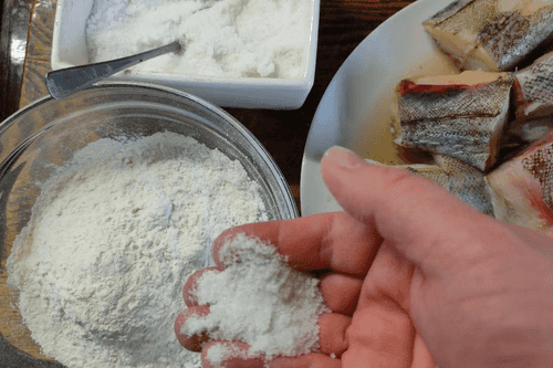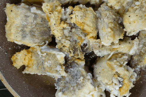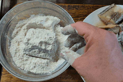 Куски рыбы обвалять в муке.