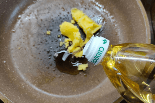 На сковороде нагреть половину топленого и растительного масла.
