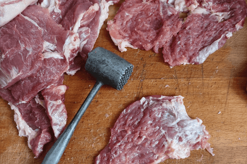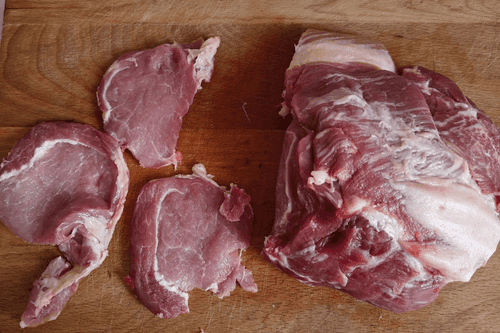 Мясо нарезать тонкими стейками.